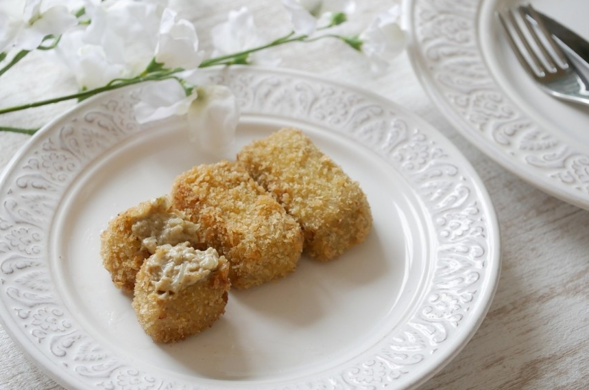 - 生地を6から8等分に切り分けて、小麦粉→卵→パン粉の順に衣をつけます。